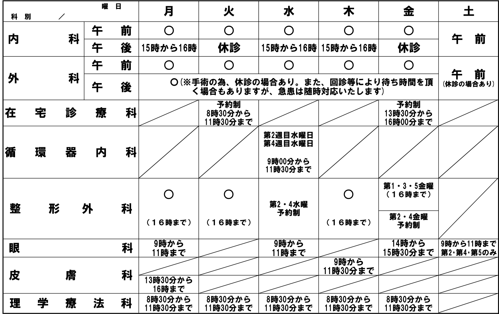 - ※診察時間の変更や休診の場合がありますのでご了承ください。問合せは随時受付けております。